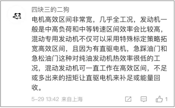 当然这是针对燃油车说的,插混车的发动机在电机和电池的帮助下,可以绝大部分时间里在最大热效率区间工作,感兴趣的硅友可以看下面这个解释。