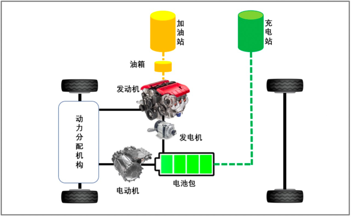 高速行驶或者亏电状态下,发动机直接驱动车轮,顺便带动发电机发电,把电能存储在电池里,这样电机就能和发动机一块工作了。
