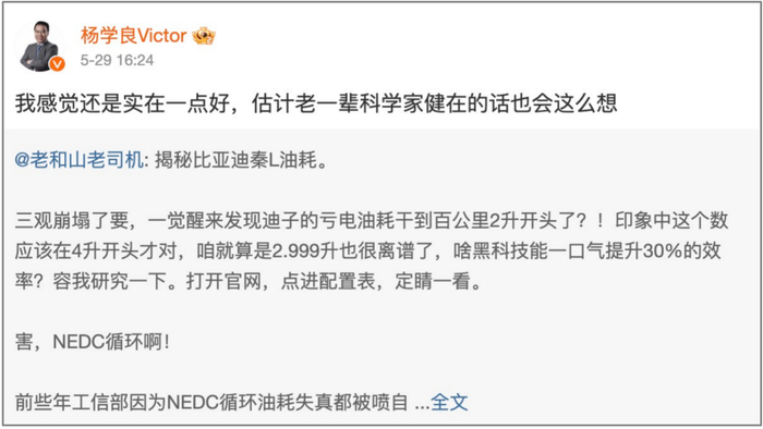 但谁成想前两天咱们的比亚迪亮出杀手锏,直接把百公里油耗打到了: