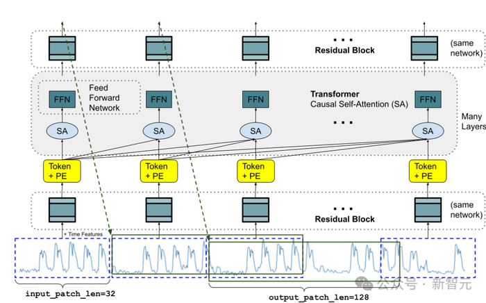 在模型架构方面,TimesFM的灵感来自于Vision Transformer(ViT)和GPT,采用了decoder-only架构,主要由三个部分组成:输入编码器、解码器和输出解码器。