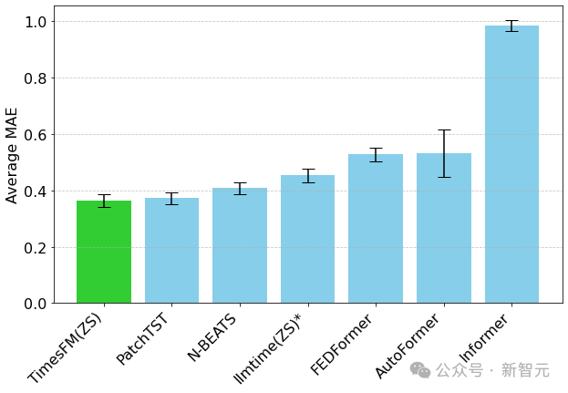可以看到,TimesFM不仅超过了llmtime(ZS)的性能,而且与在相应数据集上显式训练的有监督PatchTST模型的性能相匹配。