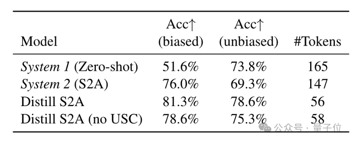 结果蒸馏后的准确率达到81.3%,超过了原始S2A的76%,生成的token数量也从147个减少到了56个。