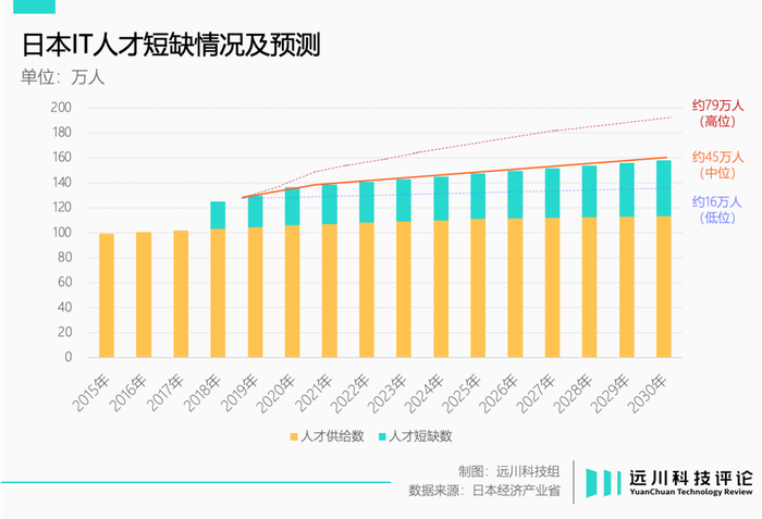然而,IT人才的短缺,恰恰是日本产业界近三十年来都难以忽视的问题。早在2000年,日本软件进口额就达到出口额的102倍。日本经产省预计,到2030年,日本IT人才缺口最多将达到79万人。