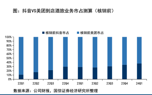 据国信证券报告,这一年,抖音的酒旅仍在渗透期和品类拓展期,GTV增速较快。根据巨量算数的报告,抖音生活服务23年GMV同比增幅达256%,分业务看,酒旅GTV增速最高为435%。