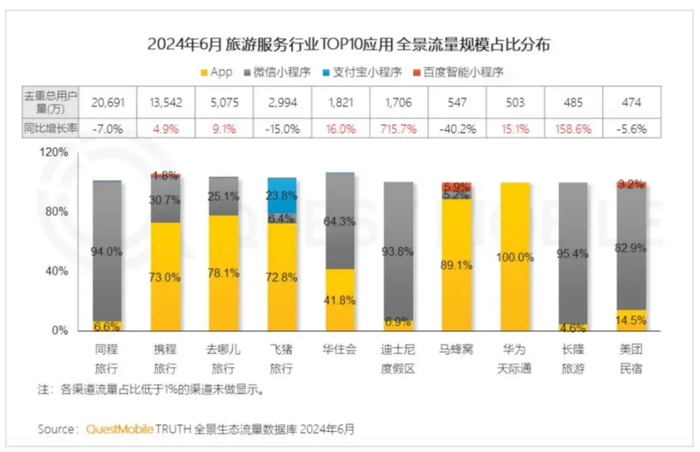 据QuestMobile数据,今年6月,同程旅行、飞猪、马蜂窝、美团民宿的全景去重总用户皆出现了同比下降的情况,其中马蜂窝流量同比下降了40.2%,飞猪旅行流量同比下降15%。