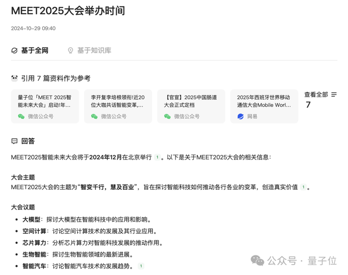 首先用量子位今年12月即将举办的MEET大会来考一考它,可以看到ima copilot引用的第一篇文章,刚好就是量子位此前发布的活动通告。