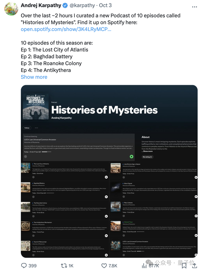 Karpathy表示他不到俩小时创建了10集播客,名为“Histories of Mysteries(神秘历史)”。