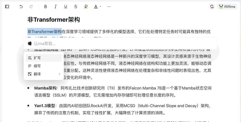 比如让它扩写一下“非Transformer架构”,效果belike。