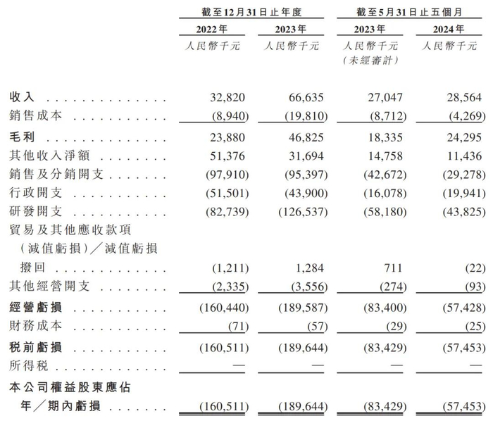 招股书显示,华昊中天2022年、2023年营收为3282万元、6664万元;毛利为2388万元、4683万元;经营亏损分别为1.6亿元、1.9亿元;期内亏损分别为1.61亿元、1.9亿元。