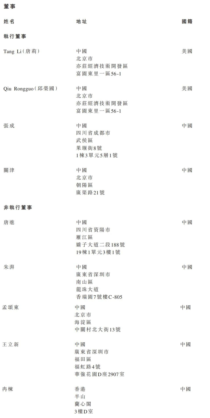 华昊中天执行董事分别为Tang Li(唐莉)、Qiu Rongguo(邱荣国)、张成、关津;非执行董事分别为唐进、朱湃、孟颂东、王立新、冉栋。