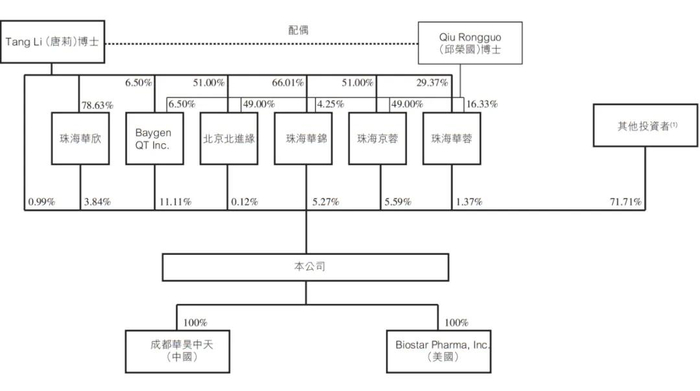 IPO前,Tang Li(唐莉)博士直接持有华昊中天约1.03%已发行股本,而BaygenQTInc.、北京北进缘、珠海华欣、珠海华锦、珠海京蓉及珠海华蓉(均由TangLi(唐莉)博士控制)则合计持有华昊中天约28.44%股权。