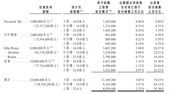 其中,Novotech SG认购300万美元,百洋健康认购200万美元,润淼资产认购800万美元,富策认购1000万美元。