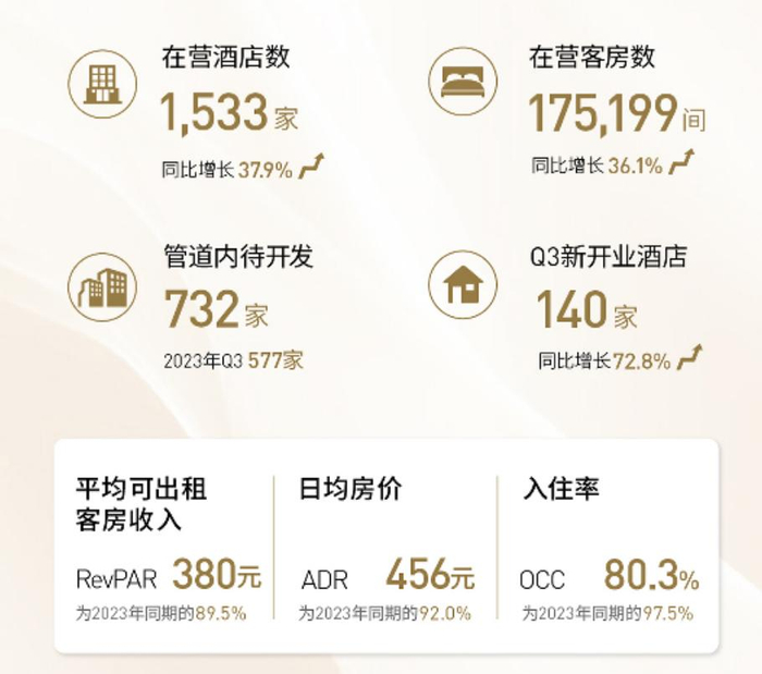 在中端市场领域,轻居3.0进一步巩固竞争优势,三季度共签约新项目38个。通过品牌联名、优化体验触点等创新运营方式,不断深耕目标用户群体。截至9月底,在营轻居3.0酒店数已达76家。