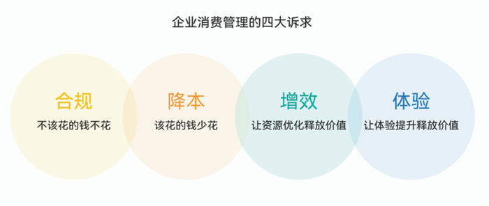 企业消费管理的“天上”,就是管理的目标。在当下复杂的经济形势下,管理目标不是单一的。结合内外部环境、以及技术的变迁,当前管理的目标可归结为四大诉求:合规、降本、增效、体验。