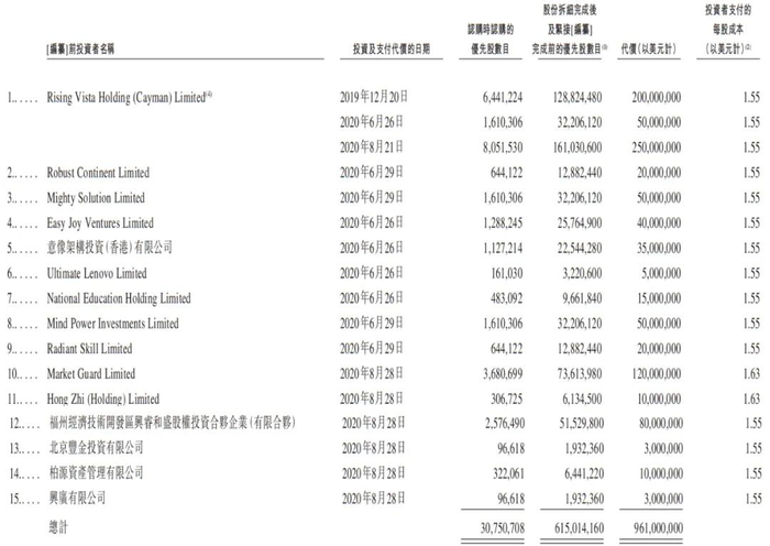 IPO前,Rising Vista Holding、Robust Continent、Mighty Solution、Easy Joy Ventures、腾讯、Ultimate Lenovo、National Education、Mind Power Investments 、Radiant Skill、Market Guard、Hong Zhi (Holding) Limited、福州经济技术开发区兴睿和盛股权投资合伙企业(有限合伙)、北京丰金投资有限公司、柏源资产管理有限公司、兴广有限公司分别持股为1.55%。