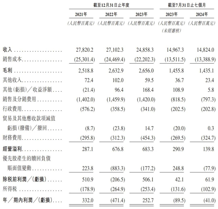 麦德龙供应链2021年、2022年、2023年经调整利润分别为1.08亿元、4.12亿元、4.3亿元;2024年前7个月经调整净利为5880万元,上年同期的经调整净利为1.59亿元。