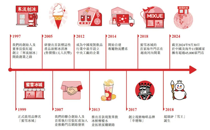 截至2024年9月30日,蜜雪冰城已于中国及海外11个国家(包括印度尼西亚、越南、马来西亚、泰国、菲律宾、老挝、柬埔寨、新加坡、澳大利亚、日本及韩国)拥有超过45,000家门店。