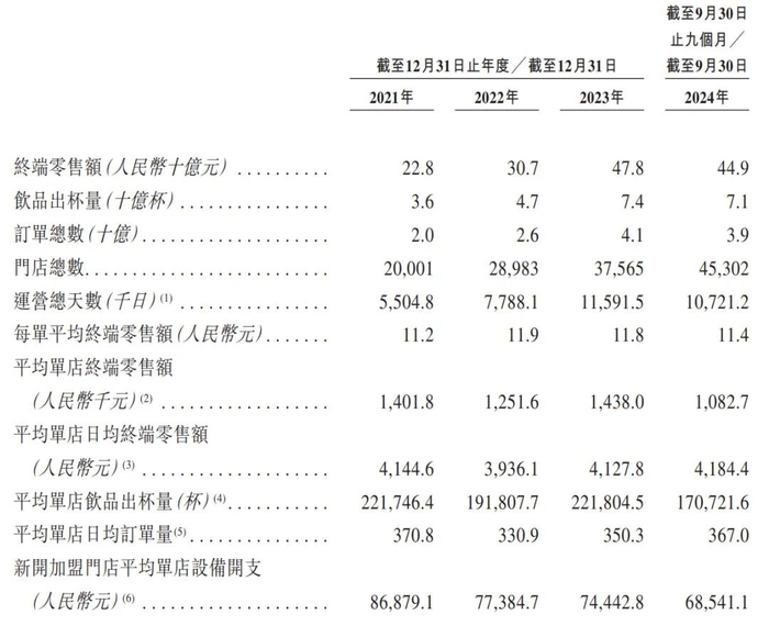 2021年、2022年、2023年及2024年前九个月,蜜雪冰城的门店分别实现约228亿元、307亿元、478亿元及449亿元的终端零售额。