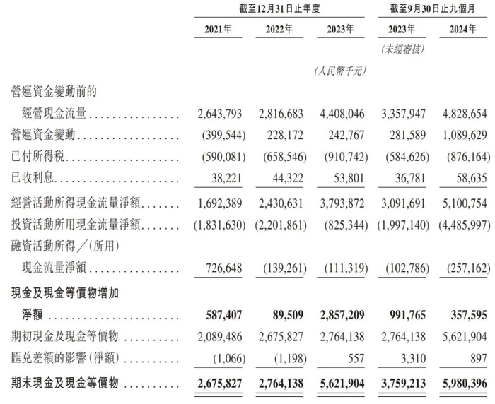 蜜雪冰城2022年、2023年及2024年前九个月,公司分别实现24亿元、38亿元及51亿元的经营活动现金流量净流入。