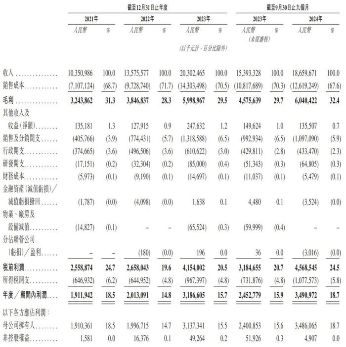 蜜雪冰城2024年前9个月实现净利润34.9亿元,较上年同期的24.53亿元增长42.3%;期内利润率为18.7%,上年同期的期内利润率为15.9%。