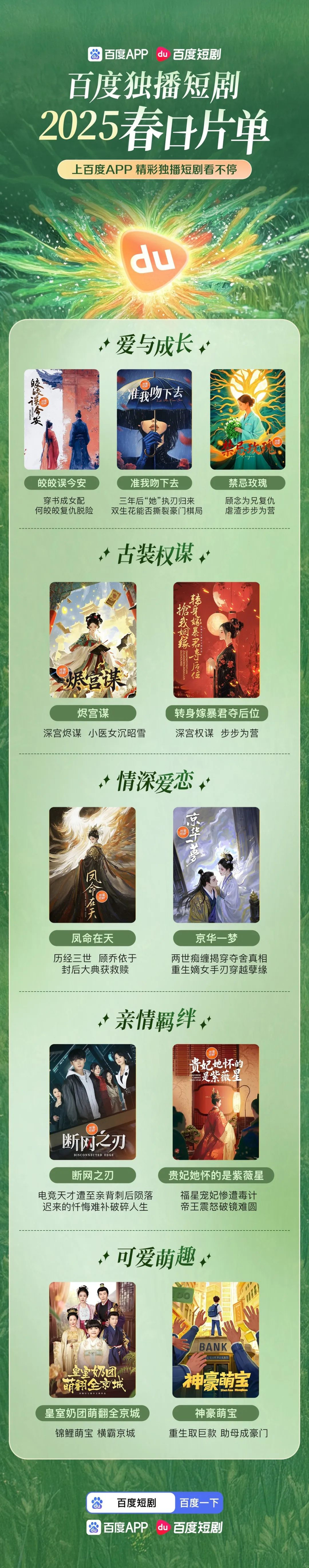 近日百度短剧还发布了2025春日片单,包含爱与成长、古装权谋、情深爱恋、亲情羁绊、可爱萌趣等多个类型,其中作品也都在传统题材基础上增加了不少创新点。