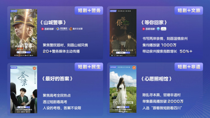 比如去年百度短剧联合平安重庆、重庆交巡警共创微短剧《山城警事》,尝试短剧和警务的结合;联合泉州文旅共创微短剧《等你回家》,集均播放量破1000万,带动泉州百度搜索指数增长50%;还有《心愿照相馆》展现四川本地官塘非遗村的文化风情,单集最高播放破2000万,入选“跟着微短剧看四川”的推荐项目。
