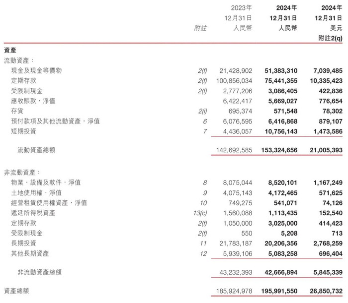 截至2024年12月31日,网易持有的现金及现金等价物为513.83亿元(约70.39亿美元),定期存款为754.4亿元(约103.35亿美元),受限制现金为30.86亿元(约4.23亿美元),应收账款为56.69亿元(约7.77亿美元)。