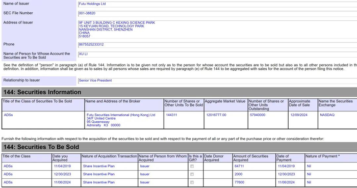 富途控股高级副总裁XU LI在2024年12月9日减持144311股ADS,套现1202万美元。