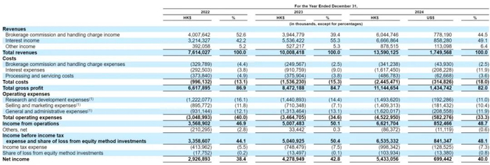 富途控股2022年、2023年、2024年运营利润分别为35.69亿港元、50亿港元、66.2亿港元(约8.52亿美元),运营利润率分别为46.9%、50.1%、48.7%。