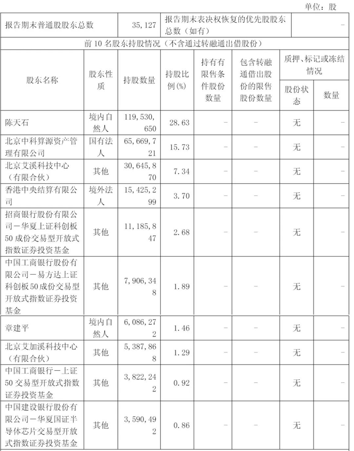 截至2025年3月31日,陈天石持股为28.63%,北京中科算源资产管理有限公司持股为15.73%,北京艾溪科技中心(有限合伙)持股为7.34%,艾溪合伙的实际控制人为陈天石。