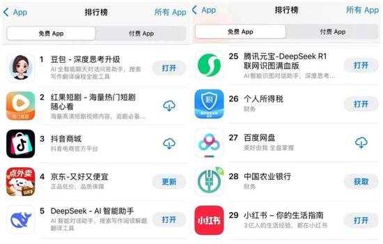 激进如腾讯,也不再追求更靠前的下载排名。最新情况是,截至5月8日,中国区苹果应用商店免费APP下载排行榜上,豆包再次超越DeepSeek,位列第一,紧随其后的DeepSeek被挤到了第五的位置,腾讯元宝则滑落到了第25名。