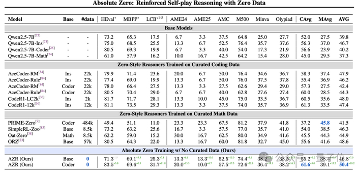 除了Qwen-2.5-7B-Coder,研究者还在其他几个预训练语言模型上测试了“绝对零”的性能: