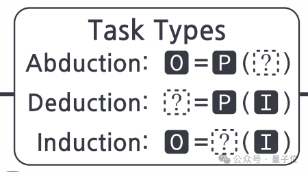 根据p、i、o是否已知,“绝对零”将推理任务划分为三种基本类型——溯因(Abduction)、演绎(Deduction)和归纳(Induction):