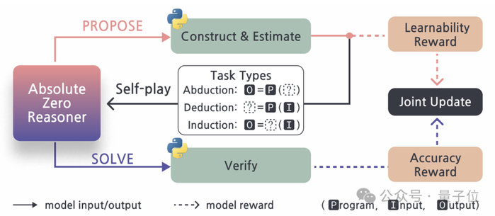 “绝对零”采用了一种自我博弈的学习范式。在这个范式下,一个统一的语言模型扮演Proposer和Solver两个角色。