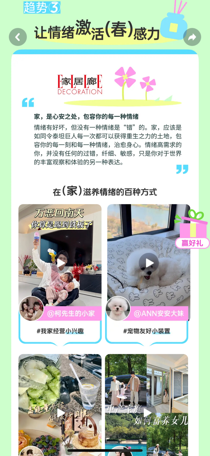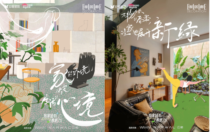 一方面,巨量星图选择与家居领域头部媒体《ELLEDECO 家居廊》合作,发布文章系统性地解读了三大趋势的内涵,并配套设计系列视觉海报,在微信、微博及小红书等平台进行分发,有效提升了用户对春季新兴家居趋势的认知与情感共鸣。
