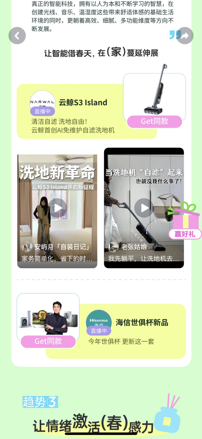 事实上,品牌在参与#我家超有春感力主话题时,可以分别从科技感、情绪力和生机感三个方面来推荐产品,让用户从不同维度都能感受到产品的优势。