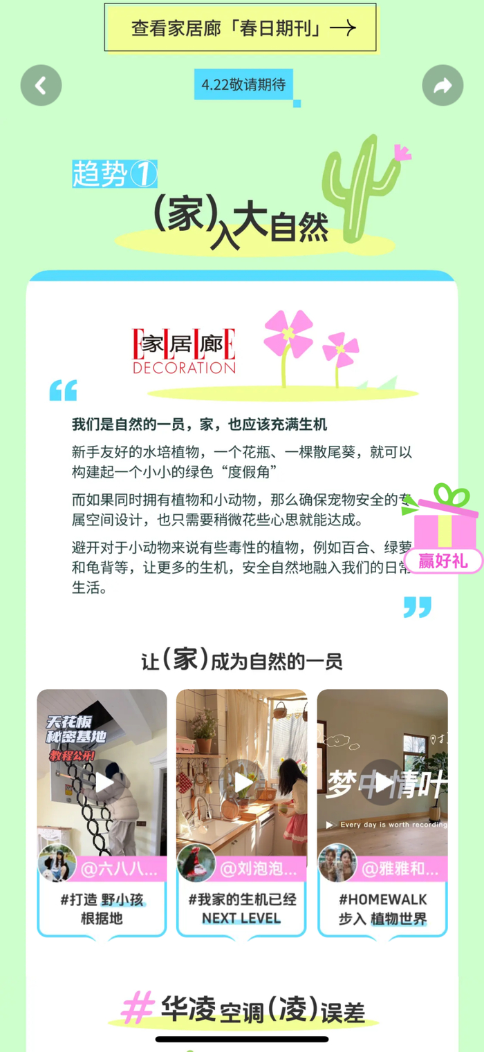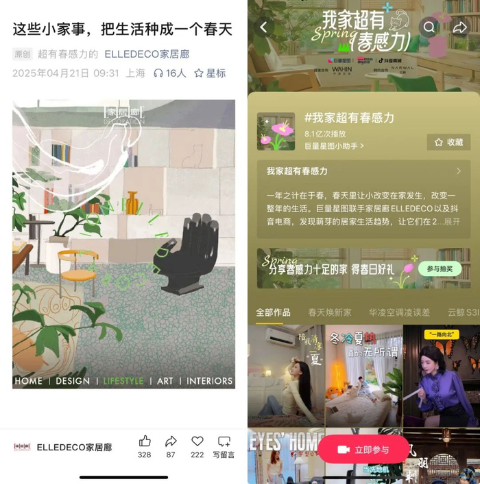 另一方面,在抖音平台内,巨量星图以#我家超有春感力 为话题,吸引海量达人从产品功能、设计美学、使用场景等不同视角的内容展现三大趋势,并具象化呈现品牌产品的优势和价值。目前该话题下的视频播放量已达到8亿次。