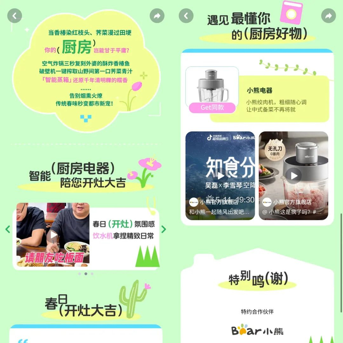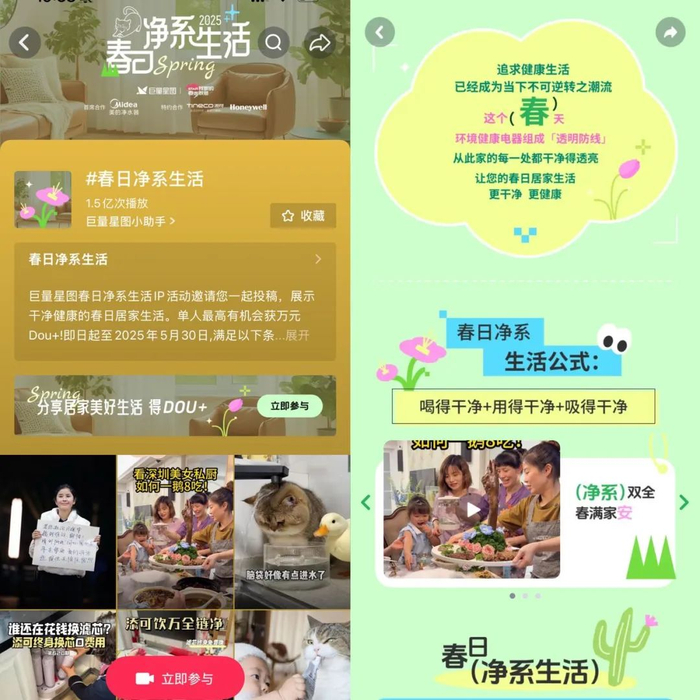 围绕这三大趋势,巨量星图还进一步做了垂直场景化延伸——以 #春日开灶大吉和#春日净系生活两个主题,聚焦在了厨房电器和两净电器这两大赛道,也卷入了更多品牌参与。