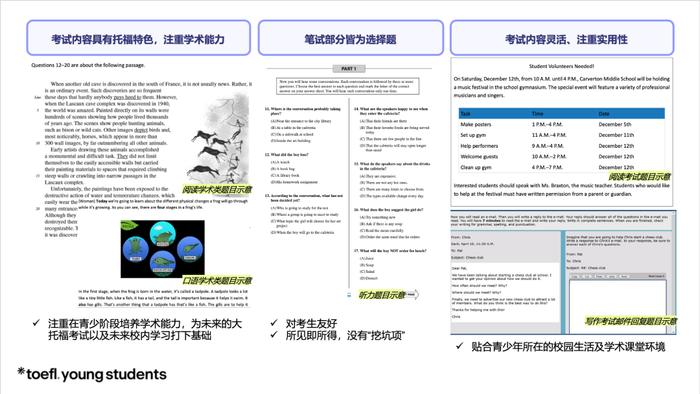 从美国东海岸的精英私校到国内顶尖国际院校,近千家教育机构采用该测评作为教学效果评估工具。其学术导向的测评内容,与新课标要求的「用英语学习学科知识」理念深度契合。小托福不仅帮助学生在学术场景中游刃有余,更为他们未来的学习和发展奠定了坚实基础,具有极高的实用价值。