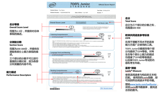 托福青少测试旨在测评8-17岁考生在英语教学环境下的语言运用能力,其成绩可作为近1000所北美中学和国内众多国际学校的入学申请语言证明和定期水平检测;同时能向教师和家长全面地反映考生的能力优势与弱项,为下一阶段学习提升提供有效指导