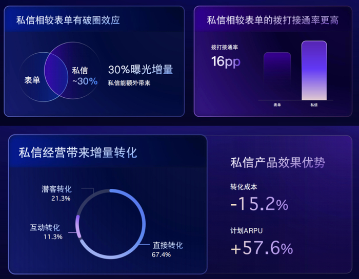 韩辉表示,商业私信并不会抢占表单的资源,而是开拓了“纯增量”,能带来额外30%的曝光,商业私信比表单客户的CRM拨打接通率会高出16%,即每100条线索能多打通16个电话。