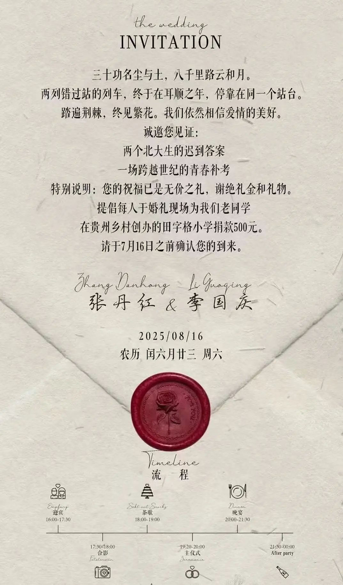 Tech星球获悉,当当网创始人李国庆将再婚。一张流传出来的请柬显示婚礼将于2025年8月16日北京举办,男方为李国庆,女方为李国庆北大校友张丹红。