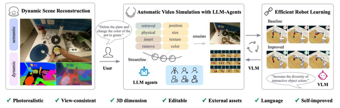 一篇是《RoboPerls》,是面向机器人的可编辑视频仿真框架,能够利用视频构建仿真环境,具备照片级真实感。支持机器人的数据合成。