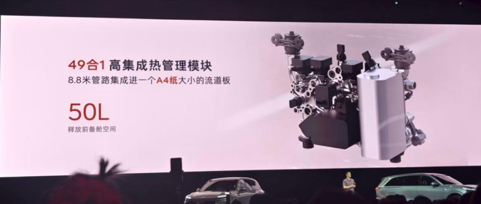 比如240L容积的超大前备箱背后,是全新开发一体式偏置空调箱,省出来90L。重构车辆前端模块,又省出来90L。自研49合1的热管理集成模块,省出来50L。
