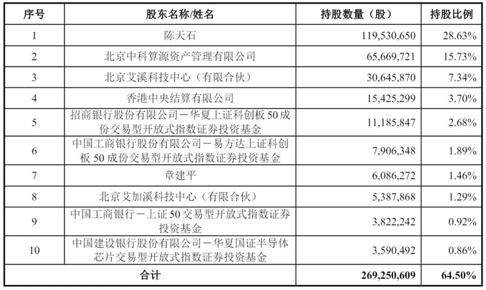 截至2025年3月31日,陈天石持股为28.63%,北京中科算源资产管理有限公司持股为15.73%,北京艾溪科技中心(有限合伙)持股为7.34%,艾溪合伙的实际控制人为陈天石。