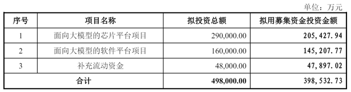 其中,20.54亿元用于面向大模型的芯片平台项目,14.5亿元用于面向大模型的软件平台项目,4.8亿元用于补充流动资金。