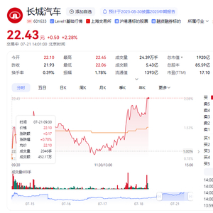 今天一开盘,长城汽车股价上涨0.78%。截至发稿前,股价上涨2.3%。