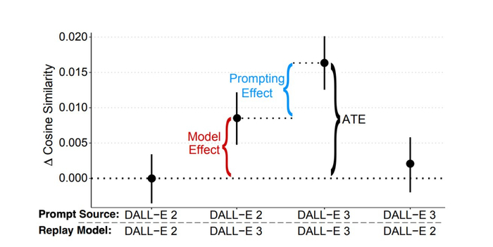 结果显示,相同提示在DALL-E 3上运行时余弦相似度提升0.0084(p<10^-8),占两组总性能差异的51%。