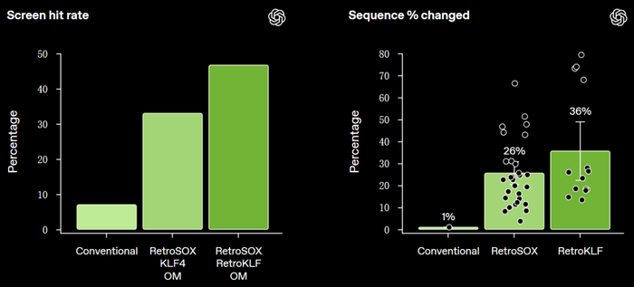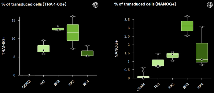 OpenAI的体外实验结果显示,这些经重新设计的蛋白质所诱导的干细胞重编程标记物表达量,比野生型对照组高出50余倍。