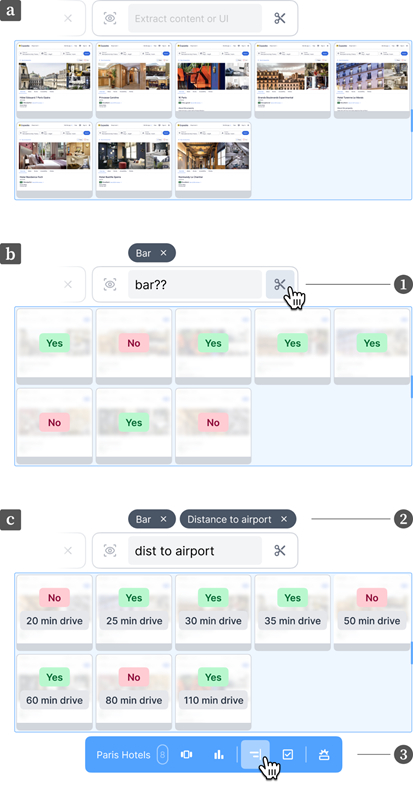 用户可将网页按网格或堆栈排列,或是把一组网页转换成表格以提取最重要的信息,比如酒店价格、设施的结构化对比。